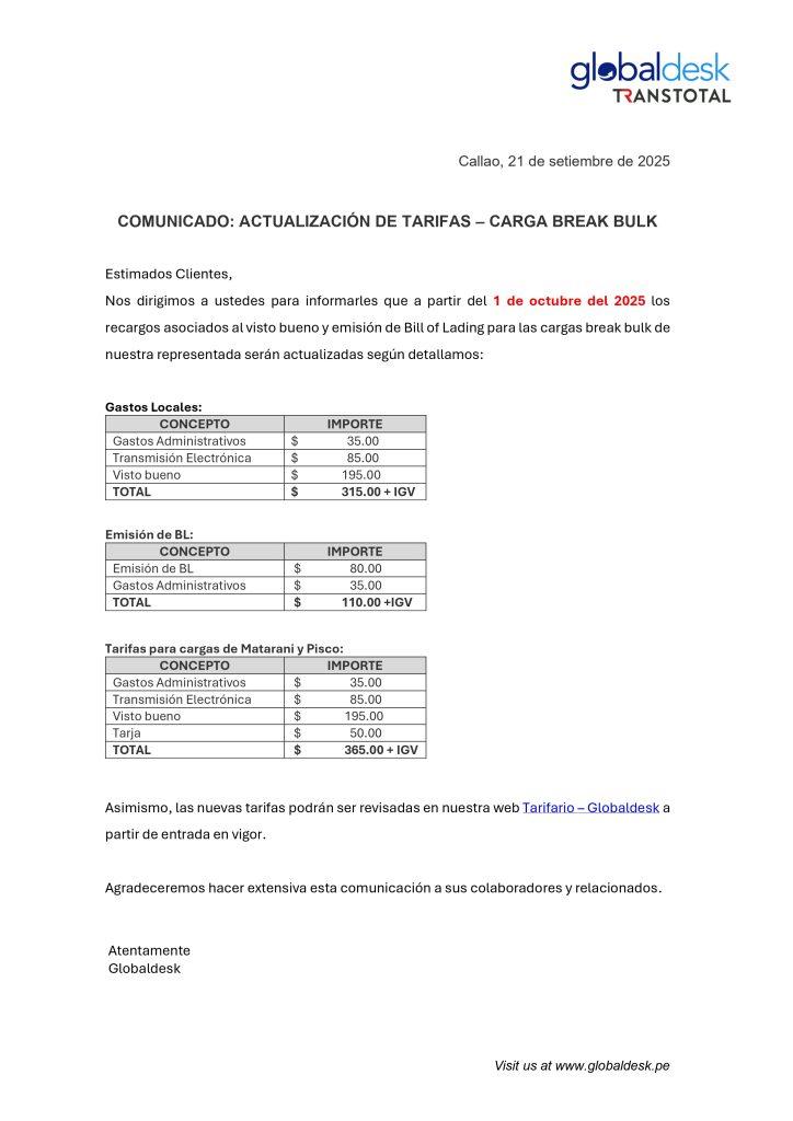 COMUNICADO: ACTUALIZACIÓN DE TARIFAS – CARGA BREAK BULK