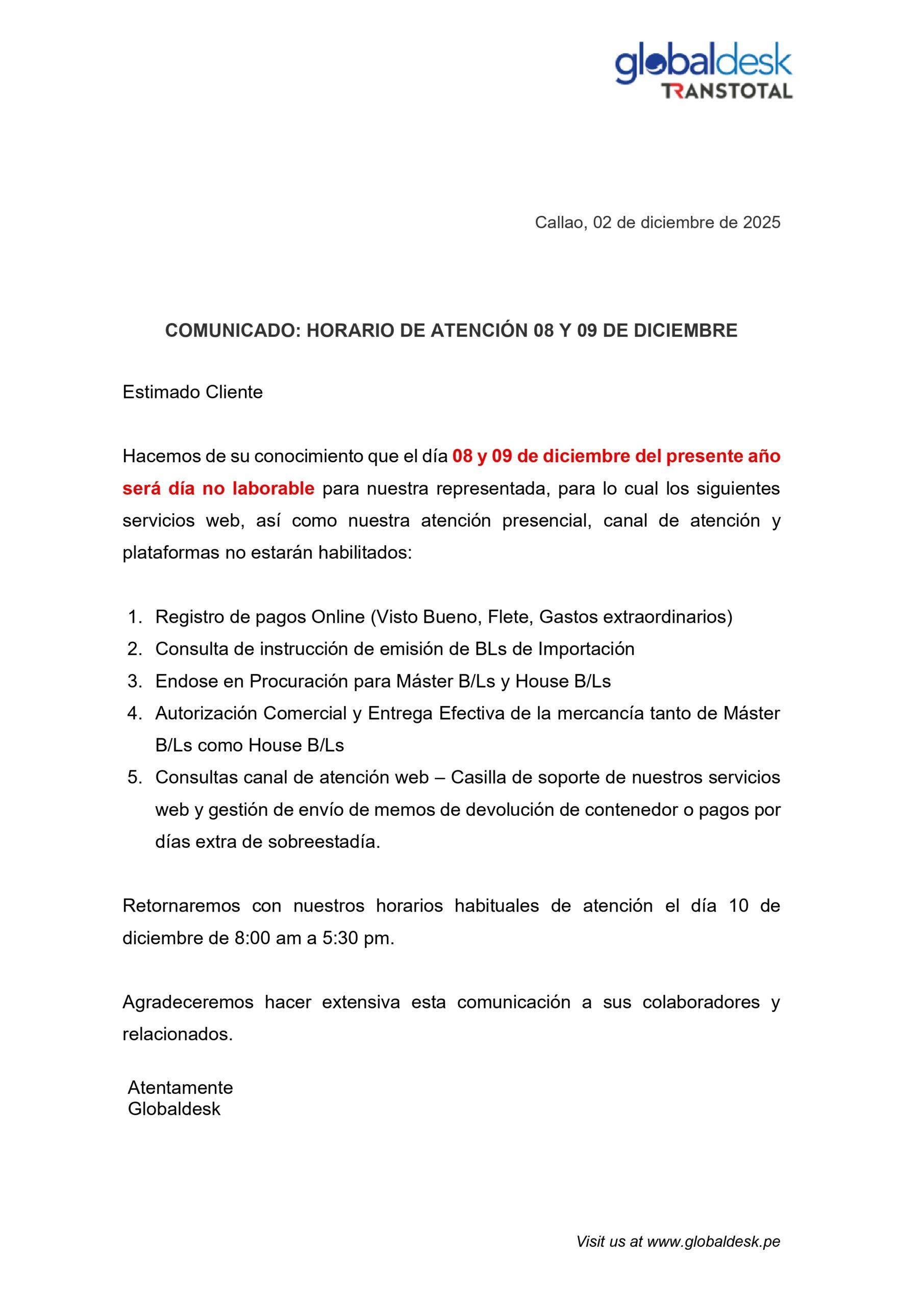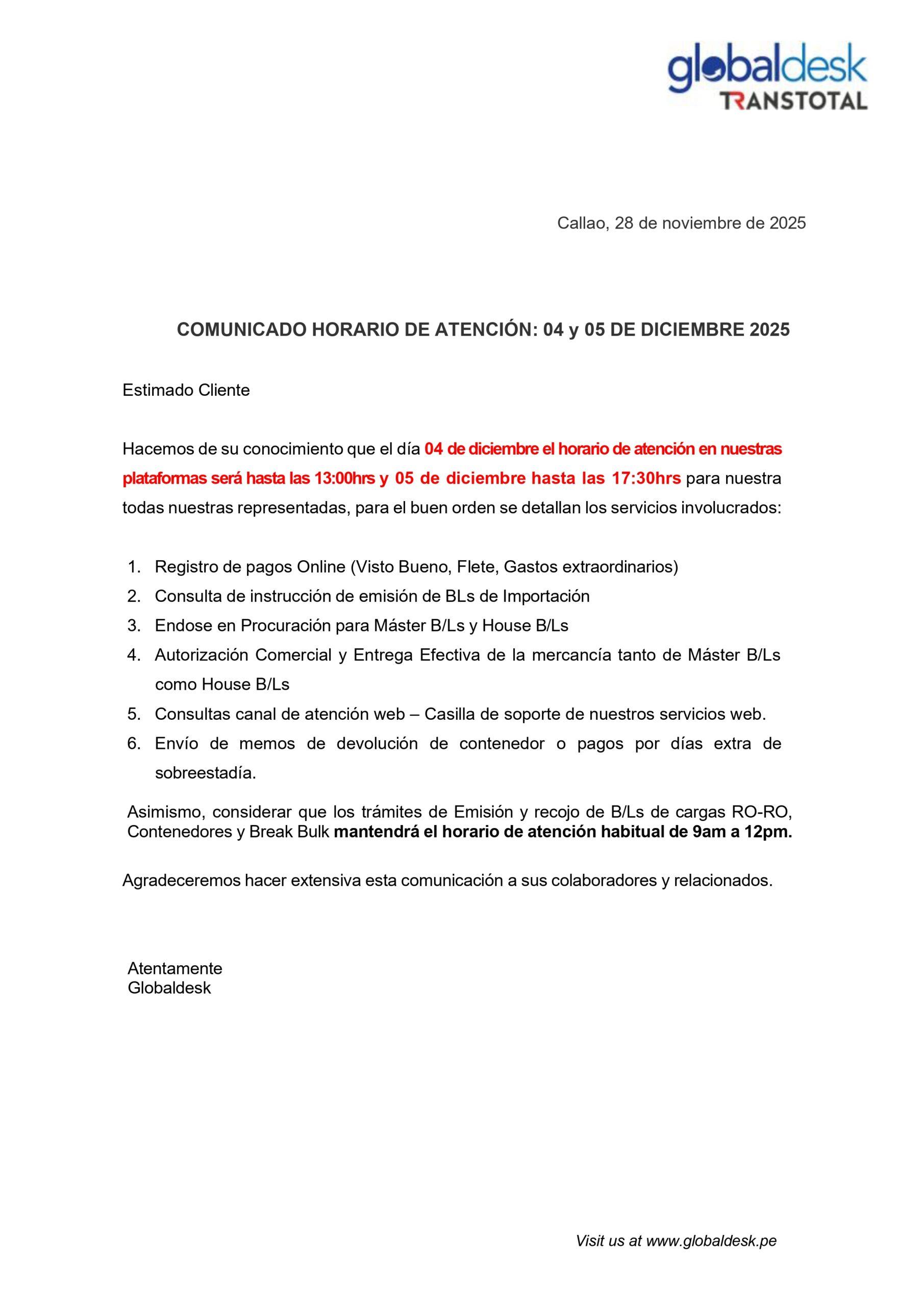 Toda consulta sobre instrucción de emisión deberá de ingresar su solicitud en www.globaldesk.pe > MyGlobalTools > Importación > Consulta de Emisión de BL.
